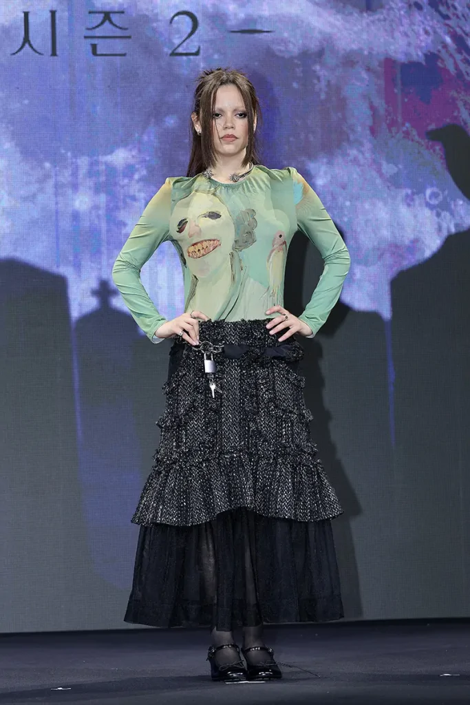 Puncaknya, dalam tur pers di Seoul, Jenna menutup rangkaian tampilannya dengan sesuatu yang benar-benar artistik. Ia mengenakan bodysuit sheer dari Simone Rocha Spring 2025, yang dihiasi print gambar abstrak misterius. Di atasnya, Jenna menambahkan rok tulle tweed hitam yang memberi volume dramatis. Untuk mempertegas detail, ia melengkapi dengan chain belt besar dan platform mary-janes.