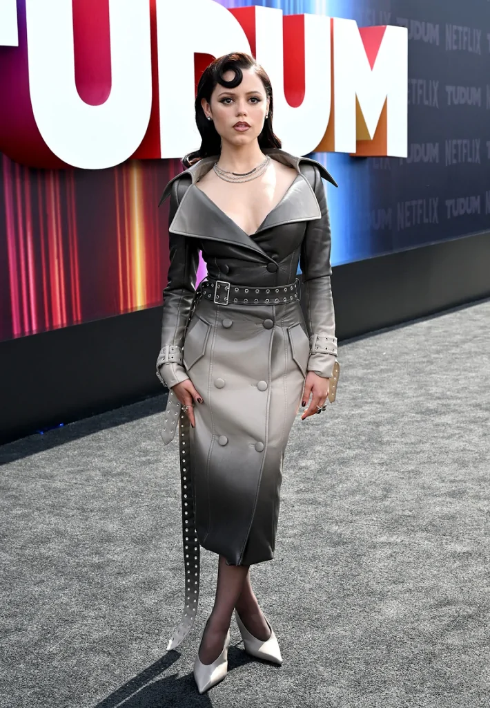 Sebelum premiere resmi, Jenna sempat hadir di acara Netflix Tudum 2025 dengan tampilan yang lebih eksperimental. Ia mengenakan trench coat kulit ombre karya desainer Markgong. Gradasi warnanya unik, dari hitam pekat di bagian atas yang perlahan memudar ke beige di bawah. Trench ini dipadukan dengan headscarf dan sunglasses gelap, menciptakan aura super dramatis dan misterius.
