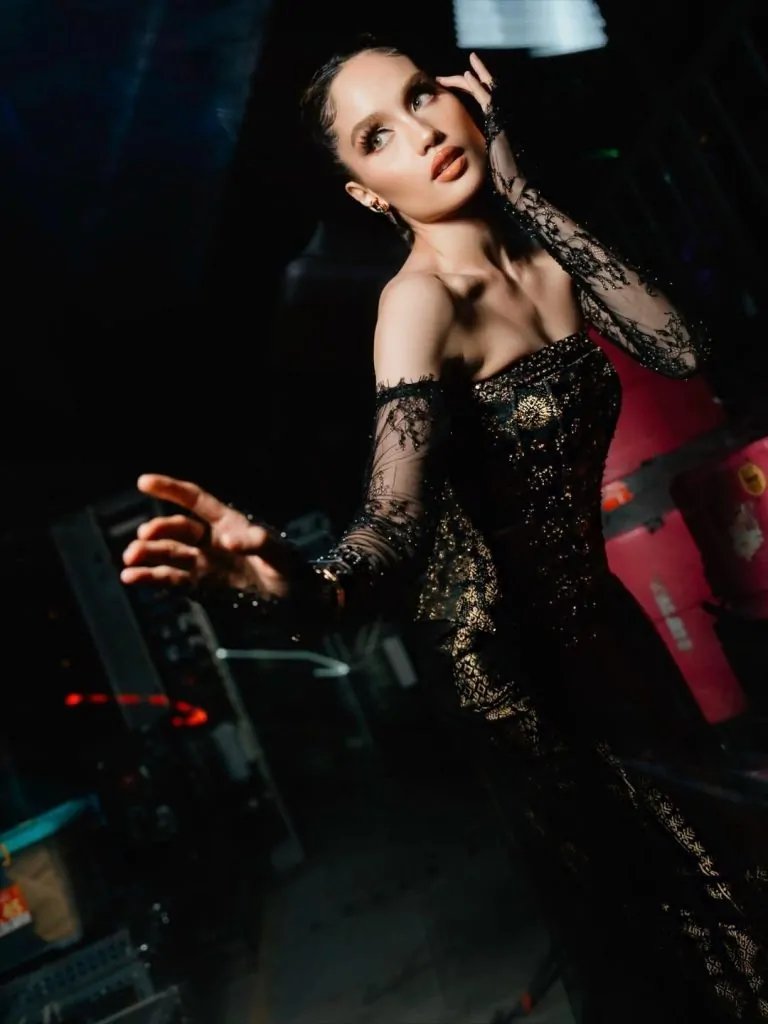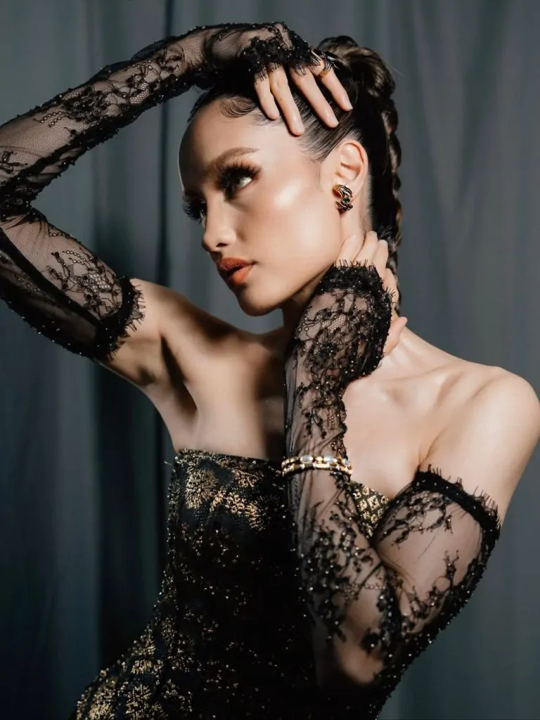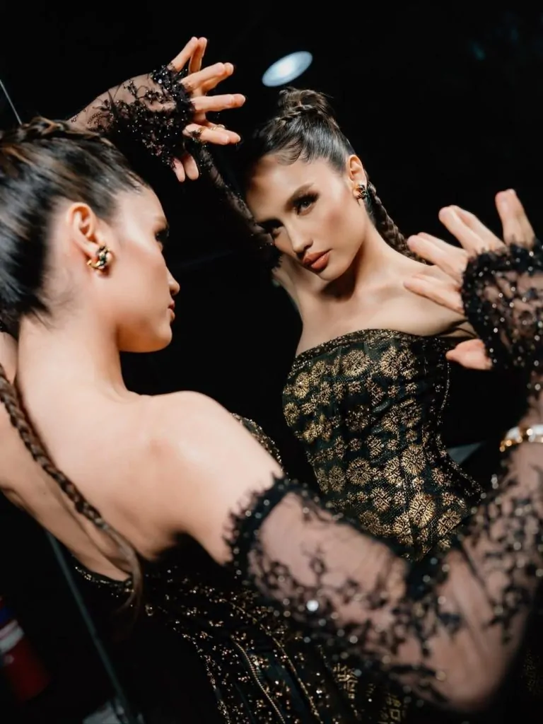 Gelang emas dengan desain bold muncul sebagai aksen tegas yang memperkaya keseluruhan styling Cinta Laura. Kilau logamnya memberikan kontras elegan terhadap tekstur lace hitam, menciptakan dialog visual yang kuat antara softness dan strength. Detail ini menghadirkan finishing touch yang mempertegas aura confident.