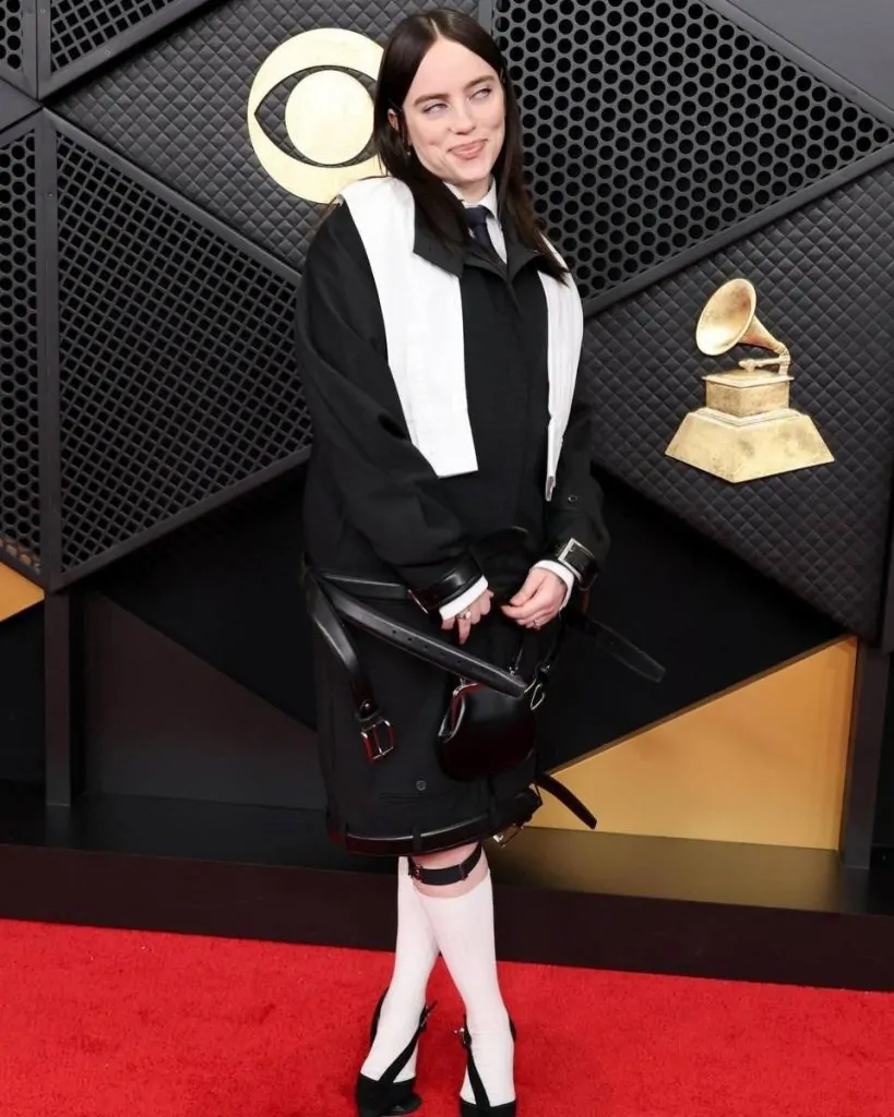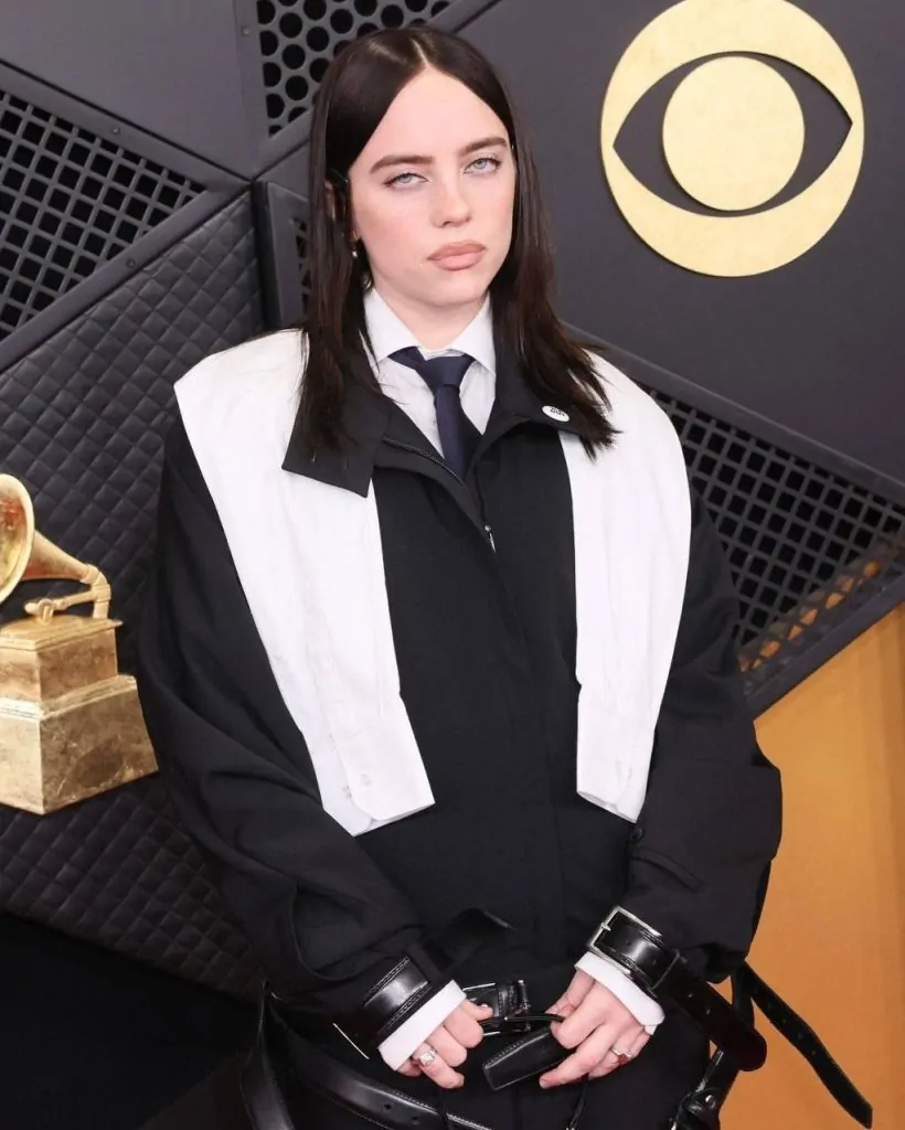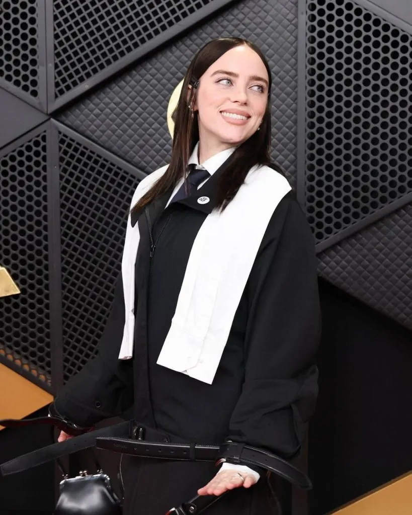 Penampilan Billie Eilish di Grammy Awards 2026 menjadi sorotan berkat perpaduan elemen maskulin dan detail edgy yang sangat kuat. Mengusung konsep dekonstruksi, busana ini menampilkan sisi eksperimental melalui penggunaan material kemeja yang dibongkar dan disusun kembali secara tidak beraturan. Kesan tangguh sangat menonjol lewat penggunaan banyak sabuk kulit yang melilit tubuh, menciptakan struktur visual yang berani dan berbeda dari gaya formal biasanya.