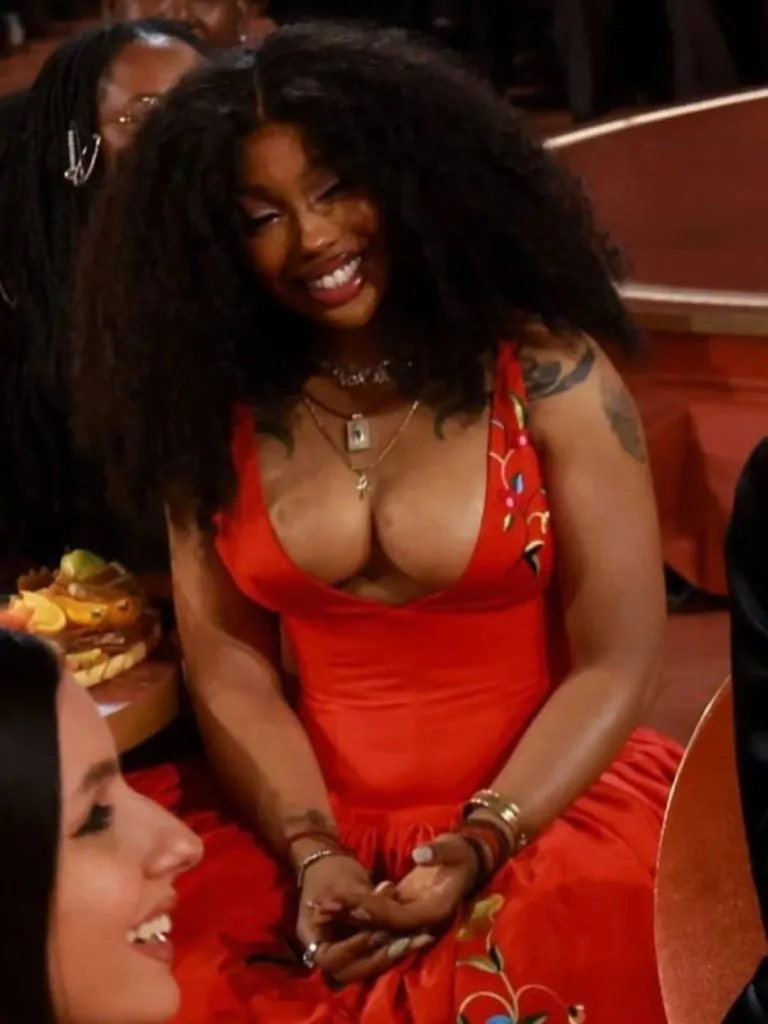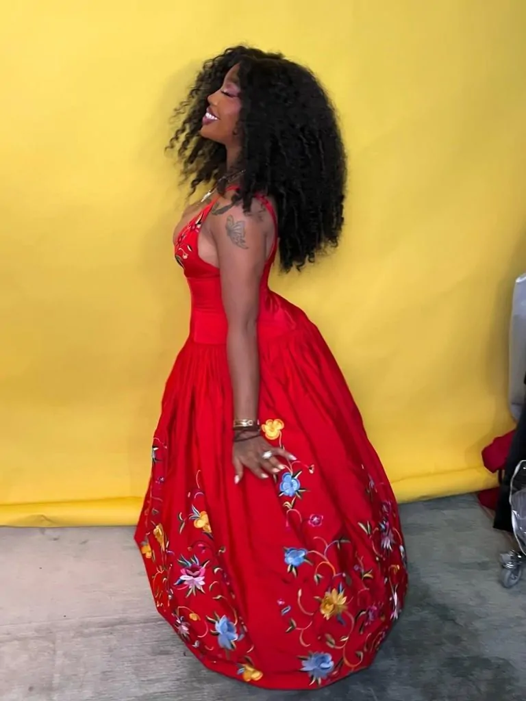 SZA mempertahankan ciri khasnya dengan membiarkan rambut hitam alaminya terurai dalam gaya keriting bervolume sangat besar. Tatanan rambut ini memberikan keseimbangan visual yang pas untuk menandingi kemegahan rok ballroom gaunnya yang lebar. Tekstur rambut yang organik menciptakan kontras yang menarik dengan permukaan gaun merah yang cenderung halus dan licin. Hasilnya, fokus perhatian audiens terbagi secara merata antara wajah sang artis dan busana megah yang ia kenakan.